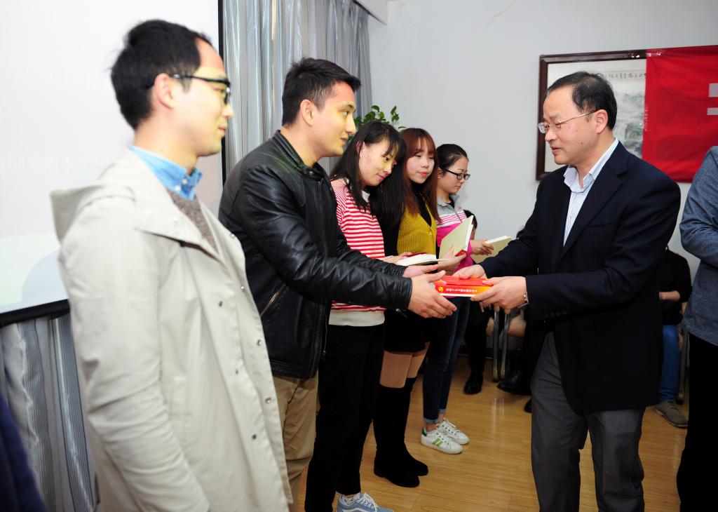 学校党委书记何光彩同志为教工党员、学生代表发放《中国共产党章程》、《党十九大报告辅导读本》和《习近平总书记关于高等教育重要论述摘编》等学习资料。