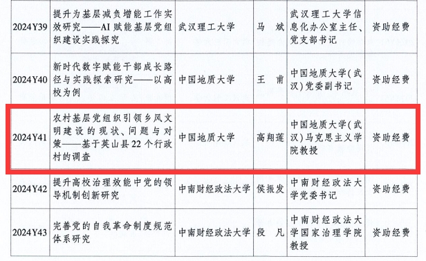 (通讯员:陈越)近日,中共湖北省委党的建设工作领导小组办公室、湖北省党的建设研究会发布《关于2024年度湖北省党的建设研究课题立项情况及有关事项的通知》,bat365官网高翔莲教授主持申报的《农村基层党组织引领乡风文明建设的现状、间题与对策——基于英山县22个行政村的调查》成功获批专项课题立项。