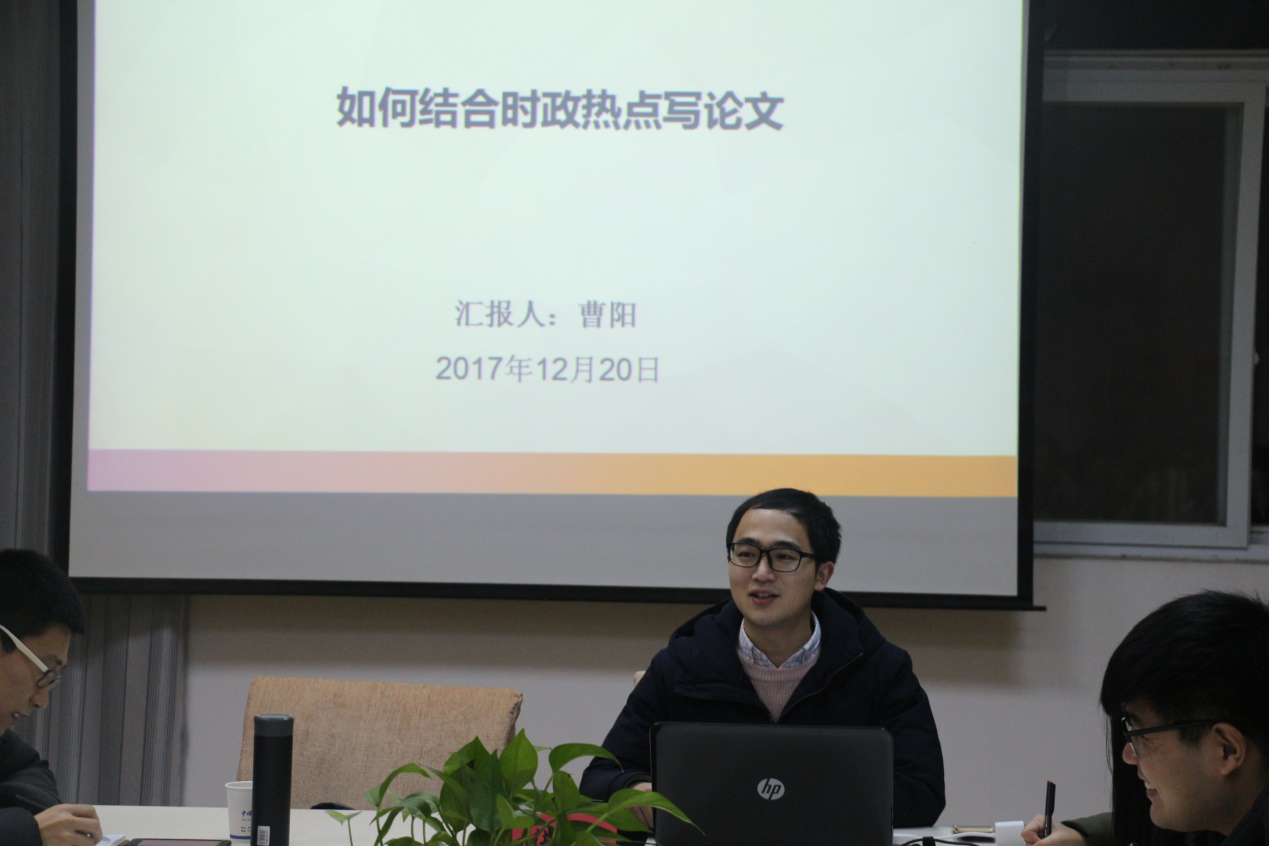 曹阳以“如何结合时政热点写论文”为题展开了三个方面的论述。首先,他阐述了“为什么要结合热点写论文”的三点原因:专业性质的要求;培养政治敏感性;可以更快发文章。接着,他就“怎么结合时政热点”展开了具体论述。最后,曹阳以自己的论文《试论大学生对思想政治教育的价值期待》为例,结合主题向大家分享了自己写作论文的历程。