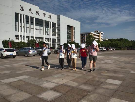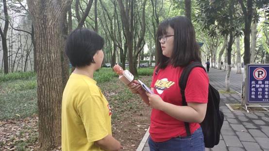 你知道发问卷时遇到同学们考试要怎么办吗?爱国新青年团队告诉你:要耐心。一天早上8时,团队成员到达武汉纺织大学阳光校区准备发放问卷。当时正值武汉纺织大学学生期末上机考试,于是戴诗雅、赵雪渊便在多次等学生考完试后进教室发放问卷,在学生考试期间便在教室外耐心等待。