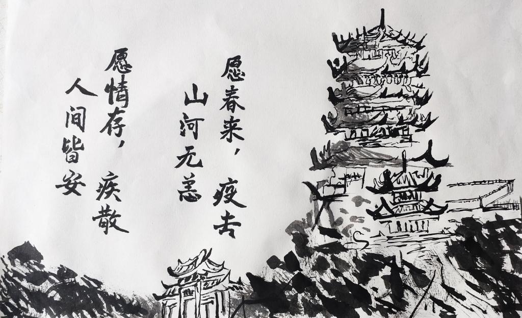 武汉,这座历史悠久的古城,在疫情肆虐之时,展示了它几百年来所积淀的坚韧与勇气。这是由bat365官网全媒体中心的同学的创作的水墨画。画中屹然伫立的,是武汉的标志性建筑——黄鹤楼,楼下草木铿锵,似在表明武汉人战胜疫情的决心,望如画中诗所言“愿春来,疫去,山河无恙;愿情存,疾散,人间皆安”,等年过春来,我们相约黄鹤楼上,看汉江澄澈,已是新篇。
