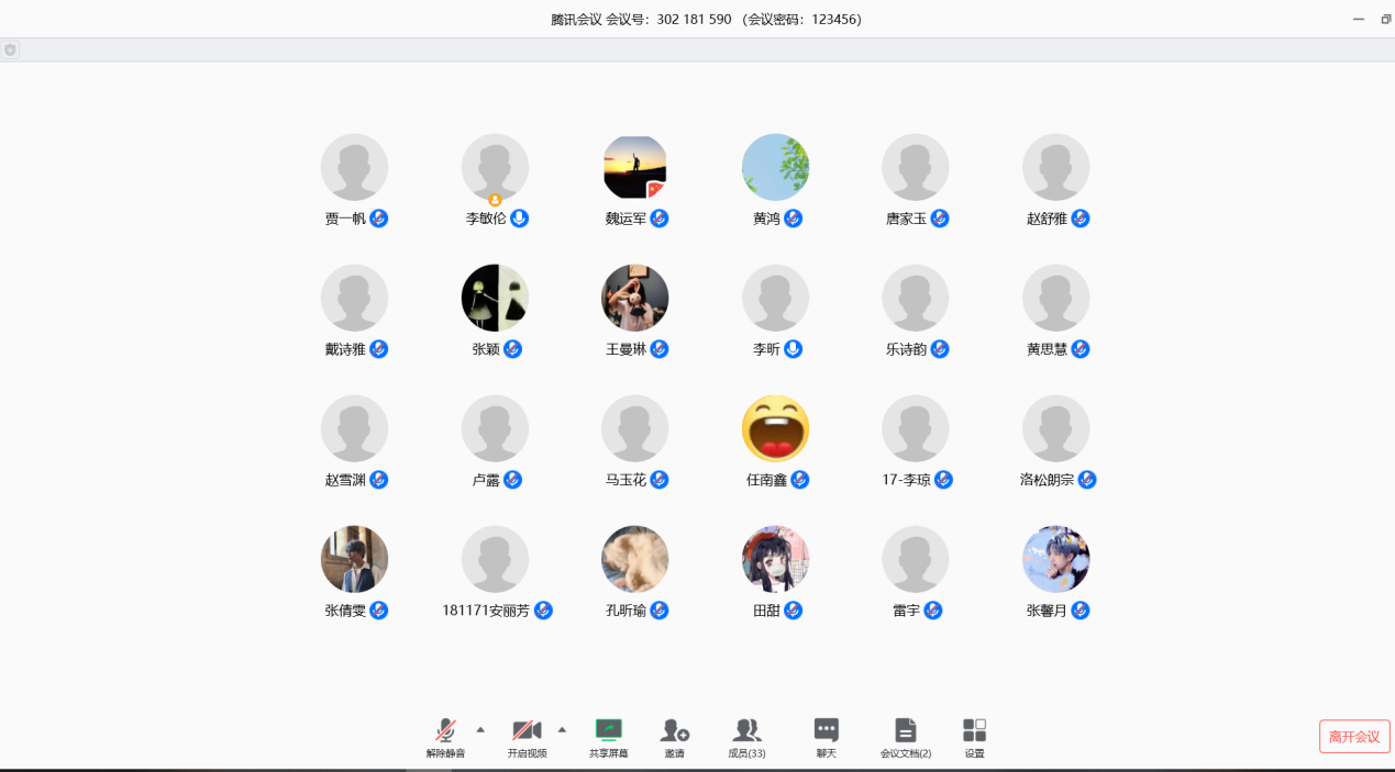 181171班新学期第一次抗疫线上班会在腾讯会议平台展开。班主任李敏伦老师和全班32名同学参加本次班会。