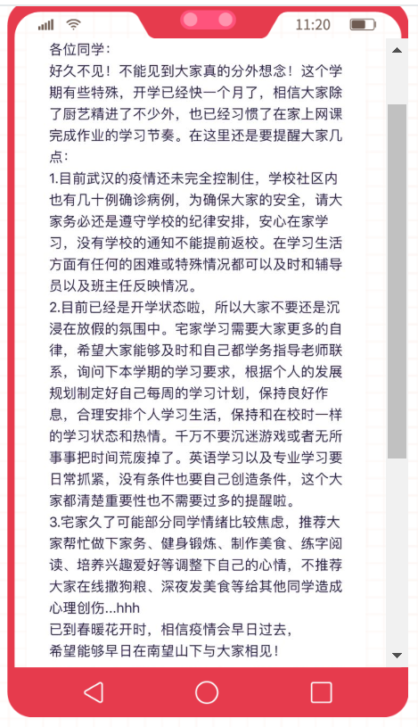 此次线上班会活动的开展也让各位同学懂得了防疫的相关知识以及在疫情期间的应对举措,增强了我们的自信心。相信同心抗疫定能共克时艰,我们一定能打赢这场战斗。