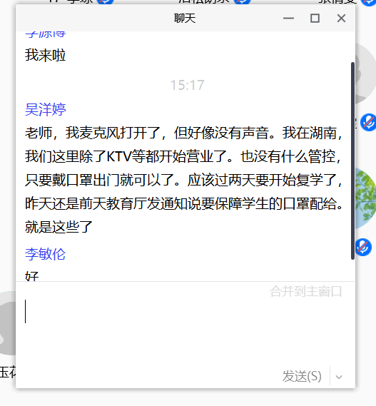 李敏伦老师首先逐个邀请同学介绍自己家乡疫情状况,询问他们抗疫期间生活经历,了解同学们是否参加志愿活动等。