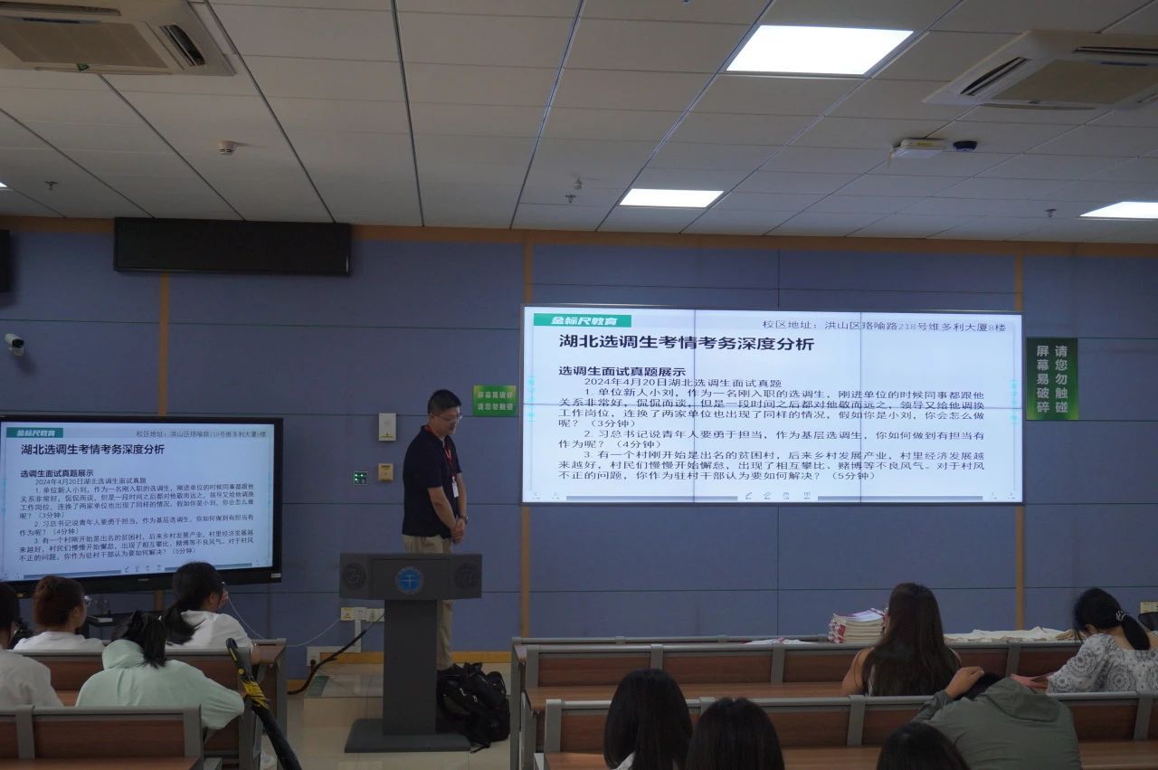 张轩老师向同学们依次介绍了选调生综合情况,选调与国考、省考、事业单位与银行的对比、全国选调生考试周期、湖北选调生笔试面试考情考务介绍,湖北选调生备考方略等详细内容。