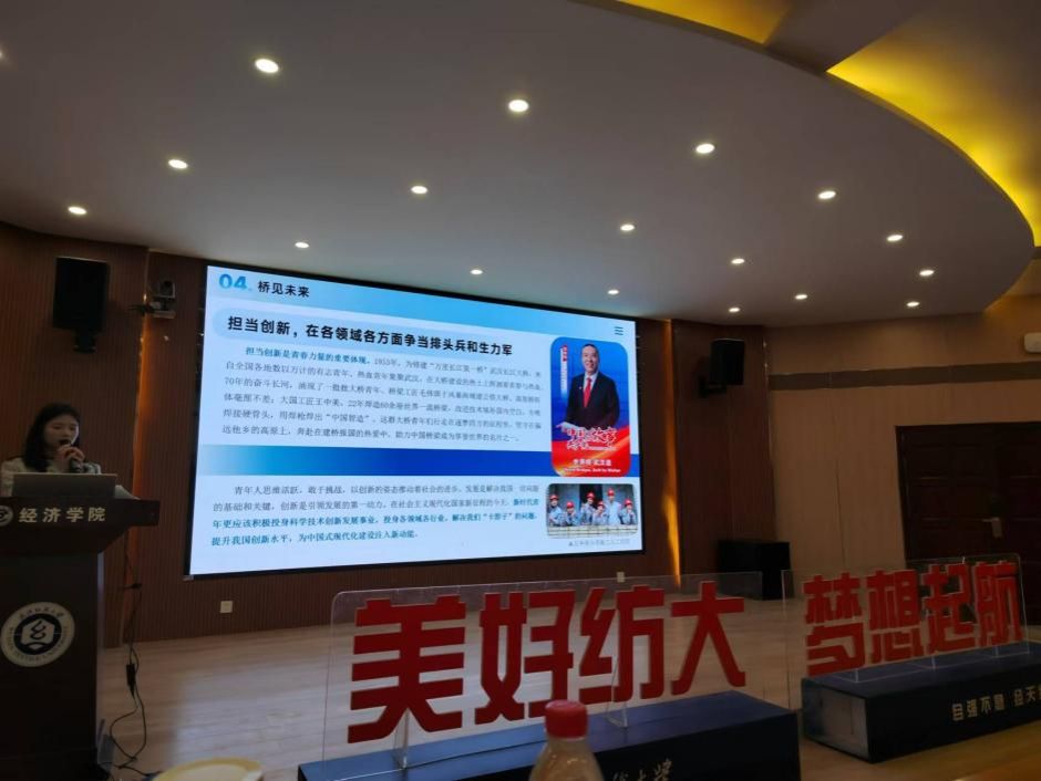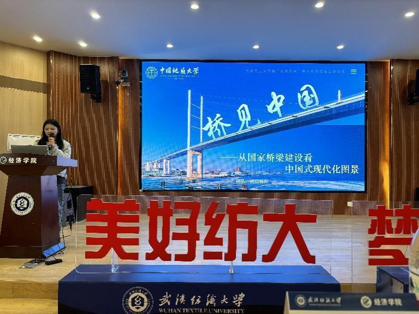 桥梁建设如同国家发展的缩影,见证了新中国从无到有、从有到优的辉煌历史。桥梁建设史也是新中国的成长史,是中国式现代化建设的生动缩影,是一张靓丽的中国名片。为深入学习和理解中国式现代化理论,bat365在线中国官网登录入口“桥启新程”宣讲团走进武汉纺织大学经济学院开展以“桥见中国——从国家桥梁建设看中国式现代化图景”为主题的线下宣讲活动。与会人员经济学院青马工程培训班学员、分团委学生会成员和院研究生会成员共200人,由“桥启新程”团队谭章洋同学担任宣讲人。