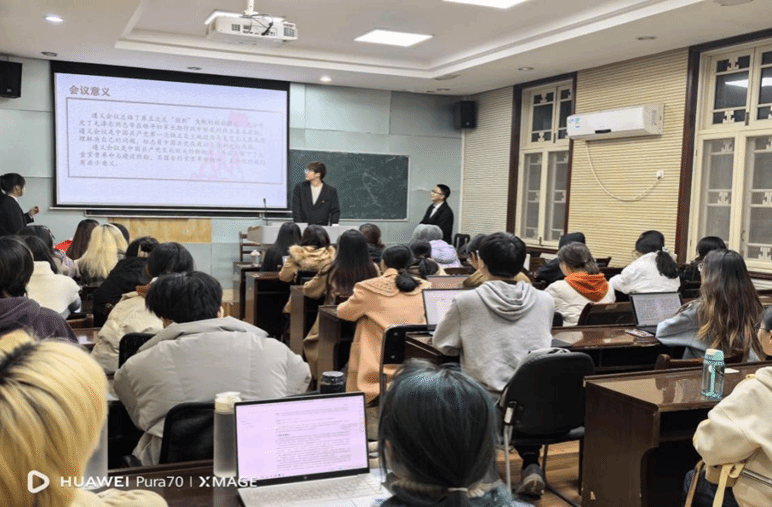紧接着进入宣讲的第二部分,重点结合”青春奋进“与”创新驱动“话题进行展开。吴妮珊同学通过具体讲述遵义会议故事揭示了遵义会议精神,并结合二十届三中全会的主题阐释了“敢闯新路”精神对于“青春奋进新征程,创新驱动促复兴“的必要性。