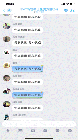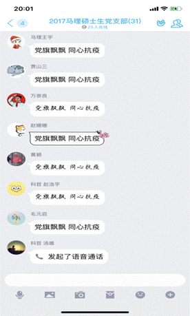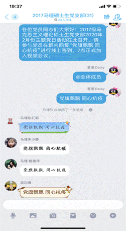 为确保参与度,晚上7点整支部书记刘聪在群内发布了线上签到标语“党旗飘飘 同心抗疫”,党员进行线上签到,共计31名党员同志参与了本次学习与交流。