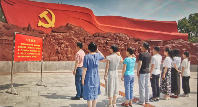 在陈潭秋纪念广场鲜红的党旗下,思想政治教育系党支部书记严世雄同志带领全体党员重温入党誓词,誓言坚定响亮