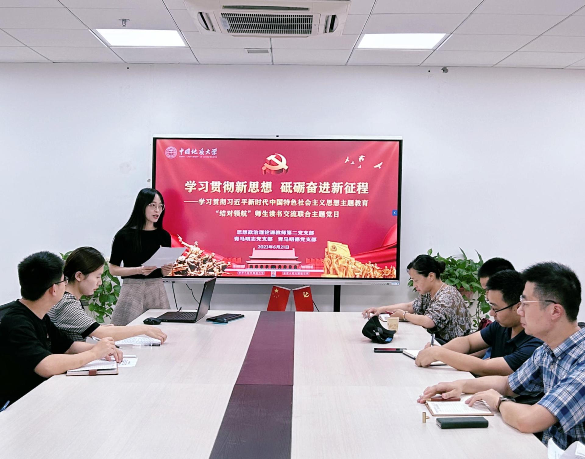 (通讯员:陈雅文、曹艺、李蔚然)2023年6月21日下午14时30分,bat365在线中国官网登录入口(武汉)bat365在线中国官网登录入口思想政治理论课教师第二党支部联合青马明志党支部、青马明德党支部在东教楼B1013会议室召开“学习贯彻新思想,砥砺奋进新征程”暨学习贯彻习近平新时代中国特色社会主义思想主题教育师生结对领航读书交流会,本次活动由党支部书记李蔚然同志和冯晓宇同志共同主持,师生党支部全体同志参与。