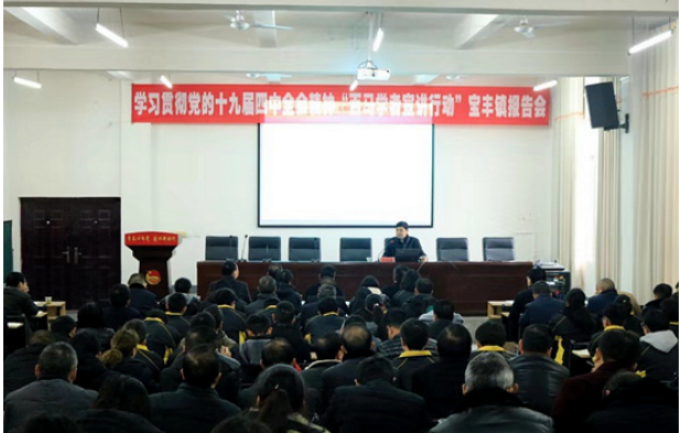 汪宗田副教授从中国共产党的发展历程入手,认真分析十九届四中全会召开的时代背景,生动地阐述了十九届四中全会的精神和重要意义,详细解读了习近平新时代中国特色社会主义思想的精髓要义,并就如何贯彻落实好十九届四中全会精神,为竹山县宝丰镇全体镇干部、镇直单位全体人员、竹山二中部分学生共计150余人上了一堂生动的思想政治理论课。