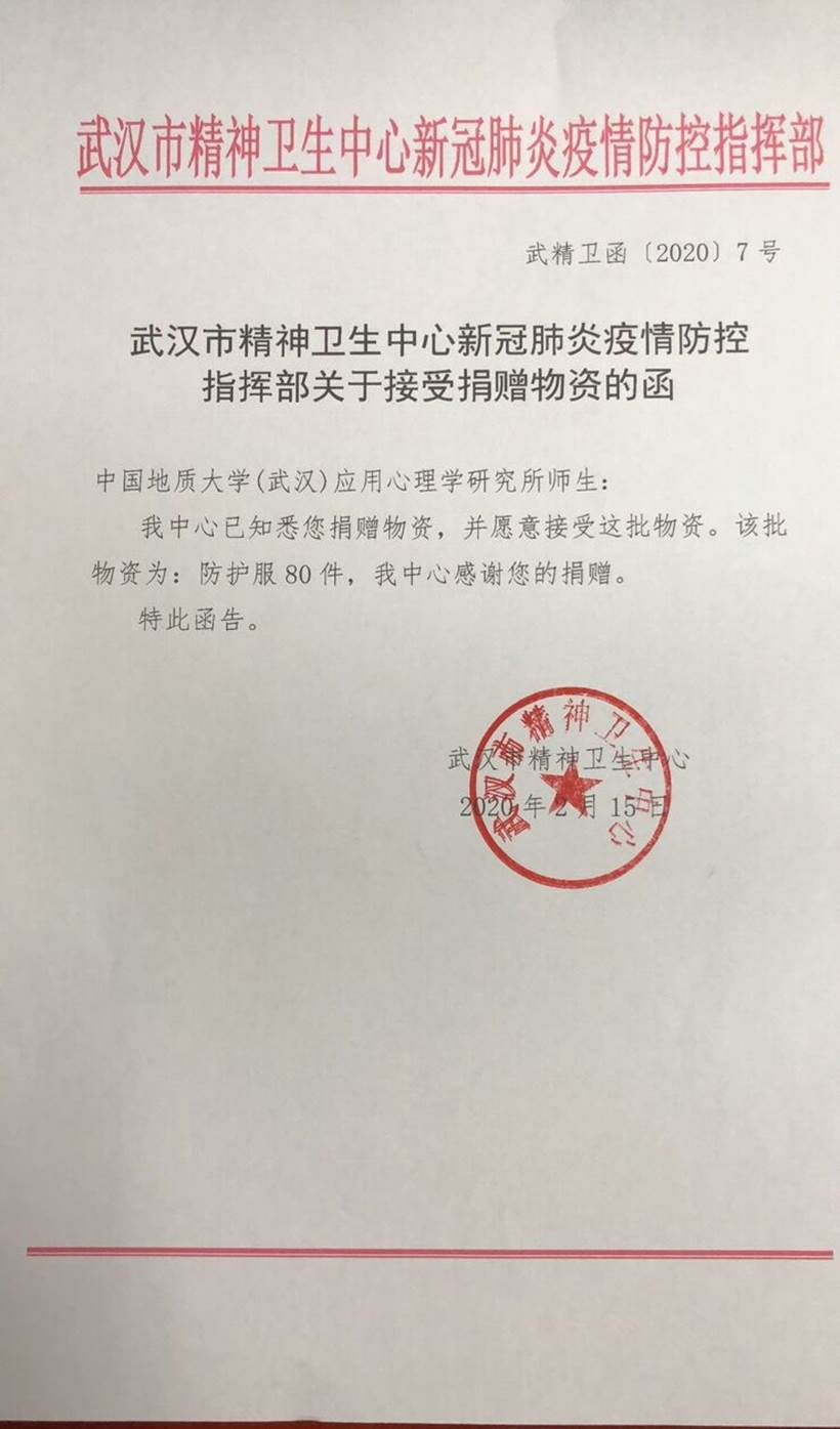 2月11日,鹅毛大雪降临武汉,封城禁令进一步升级,个人不允许出入小区。担心送货人员不能将防护服送达,心理研究所杨琴老师赶紧再次电话联系确认。老板承诺一定当天首批送货。2月11日中午,武汉市心理医院张瑾医生表示收到了物资,并发来了捐赠接收函。