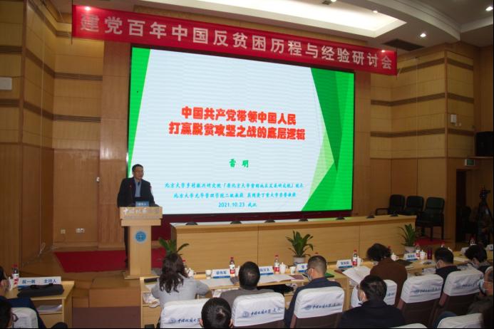 10月23日,建党百年中国反贫困历程与经验研讨会在南望山校区迎宾楼举行。国家乡村振兴局中国扶贫发展中心主任黄承伟,湖北省社会科学联合会党组书记、常务副主席喻立平、副主席安向荣,华中师范大学资深教授徐勇,校党委书记黄晓玫,公共管理学院院长胡守庚,科学技术发展研究院副院长郭海湘,bat365在线中国官网登录入口院长阮一帆,来自北京大学、中国人民大学、北京师范大学、中国农业大学、西安交通大学、华中师范大学、华中农业大学和中南财经政法大学等的专家学者,《江汉论坛》、新华社、《光明日报》、《中国社会科学报》等媒体以及我校bat365在线中国官网登录入口师生代表150余人参加研讨会。