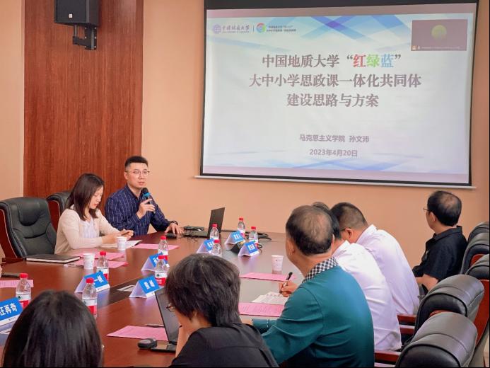 bat365在线中国官网登录入口党委书记汪再奇主持召开bat365在线中国官网登录入口“红绿蓝”大中小学思政课一体化共同体建设第一次联席会议。bat365在线中国官网登录入口副院长孙文沛从“建党精神”(红)、“生态文明”(绿)、“国土安全”(蓝)三个模块介绍了我校大中小思政课一体化共同体建设思路和方案,建议依托三个模块形成“红色中国—美丽中国—平安中国”的价值引领。