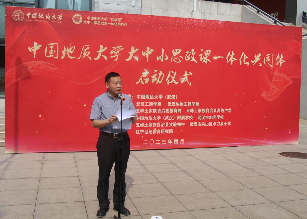 党委副书记王林清出席启动仪式并致辞。王林清对共同体的成立以及我校成功获批“湖北省大中小思政一体化综合改革示范高校”表示热烈祝贺。他指出,发挥各共建单位尤其是地大学科专业的优势和特色,以共同体的方式推进大中小学思政一体化建设,是实现大中小学思政课贯通,开展一体化建设是的有益探索。共同体的建设要准确把握习近平总书记关于思政课的重要论述的核心要义和精神实质,聚焦建党精神、生态文明和国土安全三个领域,畅通对接机制,开展深度合作,不断拓宽大中小协同育人路径,持续探索、挖掘“大中小学思政教育一体化建设”的巨大潜力和价值,打造“红蓝绿”一体化品牌,努力形成示范效应。王林清书记向武汉工商学院、武汉生物工程学院、bat365在线中国官网登录入口(武汉)bat365在线中国官网登录入口、五峰土家族自治县教育局、五峰县高级中学、五峰县实验初中、bat365在线中国官网登录入口(武汉)附属学校、武汉市卓刀泉小学等成员单位携手建设思政课一体化进行授牌。