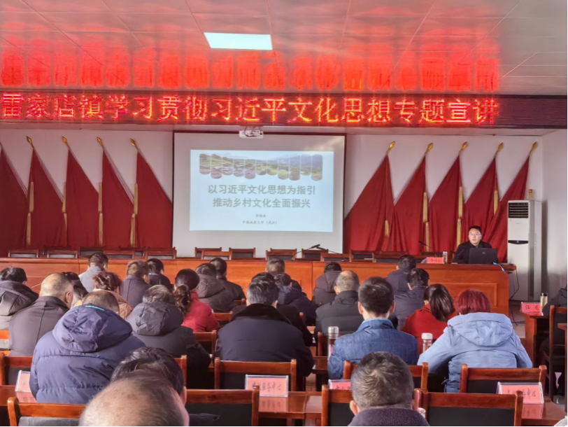 bat365在线中国官网登录入口副院长李海金教授赴雷家店镇开展理论宣讲活动。雷家店镇镇直单位负责人、32个村主要干部参加宣讲会。李海金教授以“以习近平文化思想为指引推动乡村文化全面振兴”为题,围绕充分认识习近平文化思想的重大意义、充分领会习近平文化思想的重大战略、充分把握习近平文化思想的科学方法论三个方面,并结合两个全国典型案例,深刻阐释了习近平文化思想的深刻内涵,让基层党员干部对习近平文化思想有了深入的认识和体会。