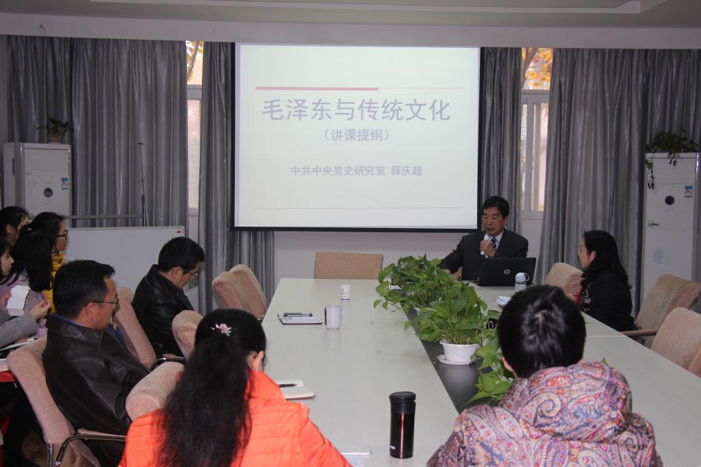 11月30日至12月5日,中共中央党史研究室原宣传教育局副局长、我校讲座教授薛庆超老师来校做学术讲座并与bat365官网师生交流。薛庆超教授先后为bat365官网师生作了《毛泽东与中国传统文化》、《如何利用文献档案资料撰写论文》、《如何申报国家级项目》等学术报告,为学校党委理论学习中心组作了《bat365在线中国官网登录入口学科建设与发展》的专题报告,受到学校师生和领导好评。
