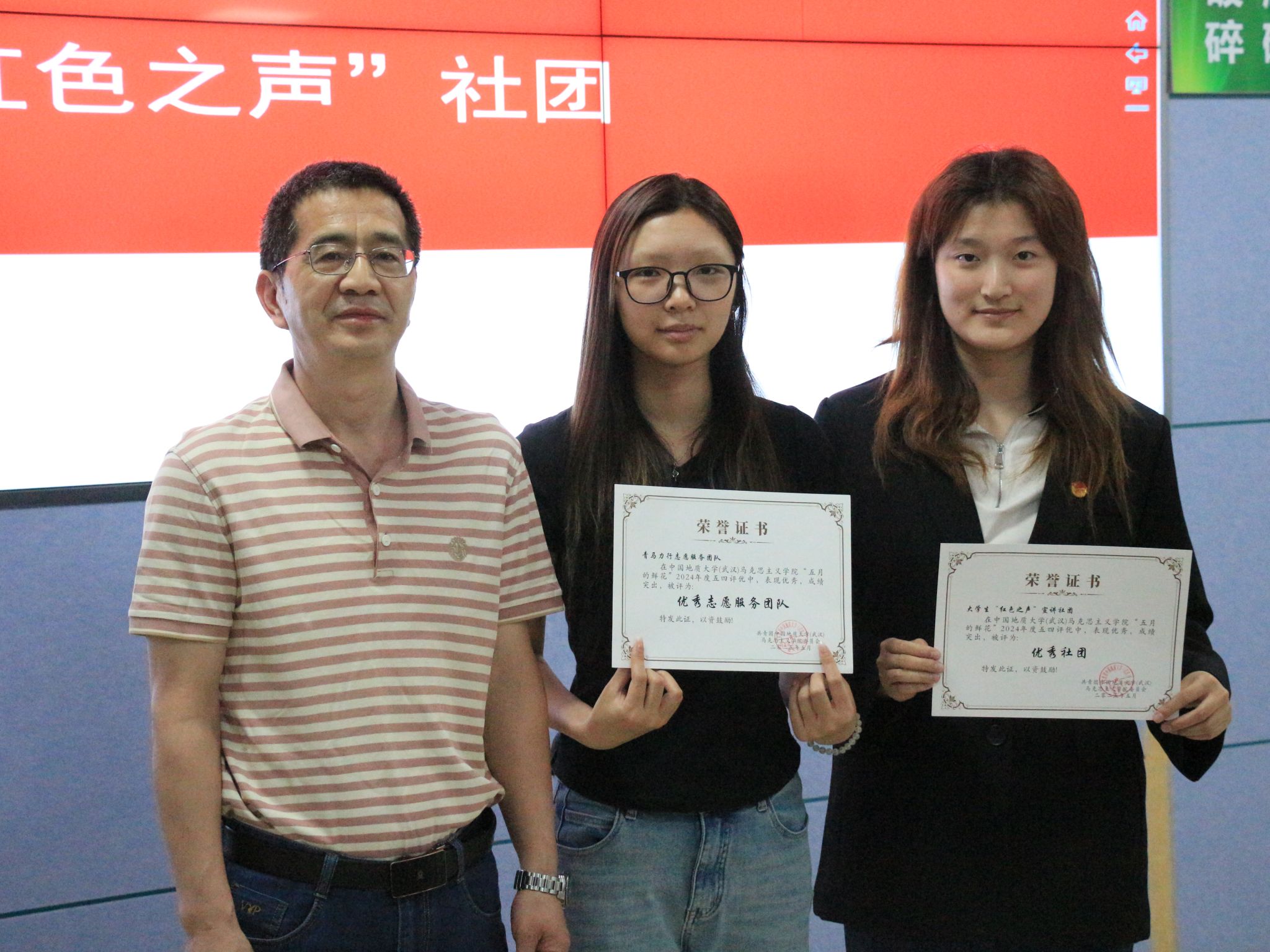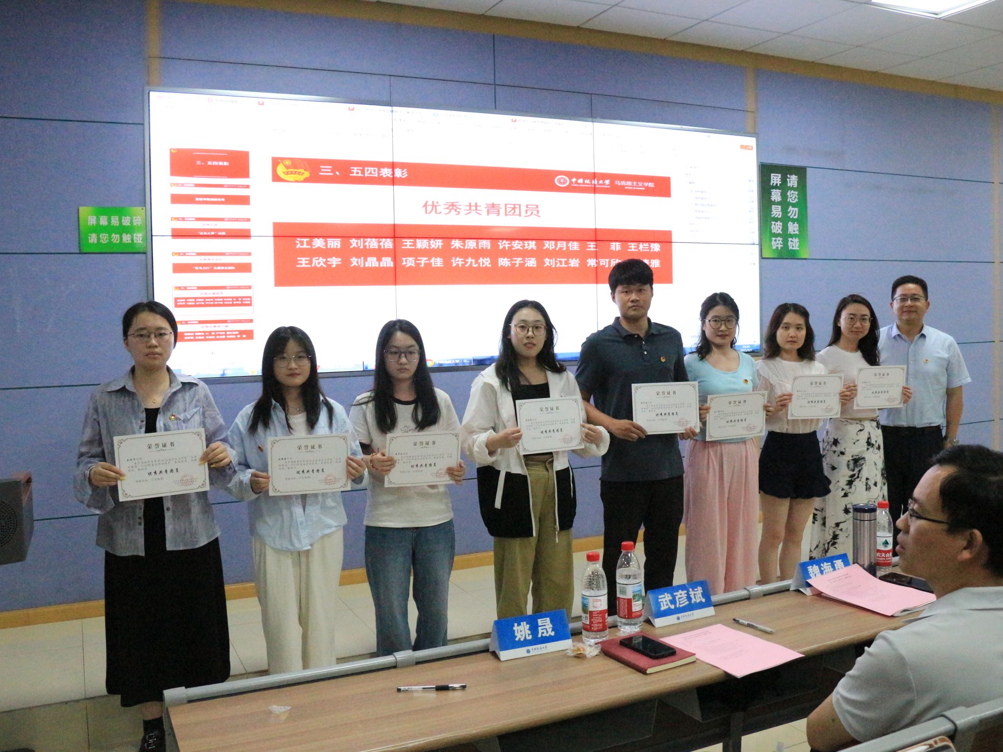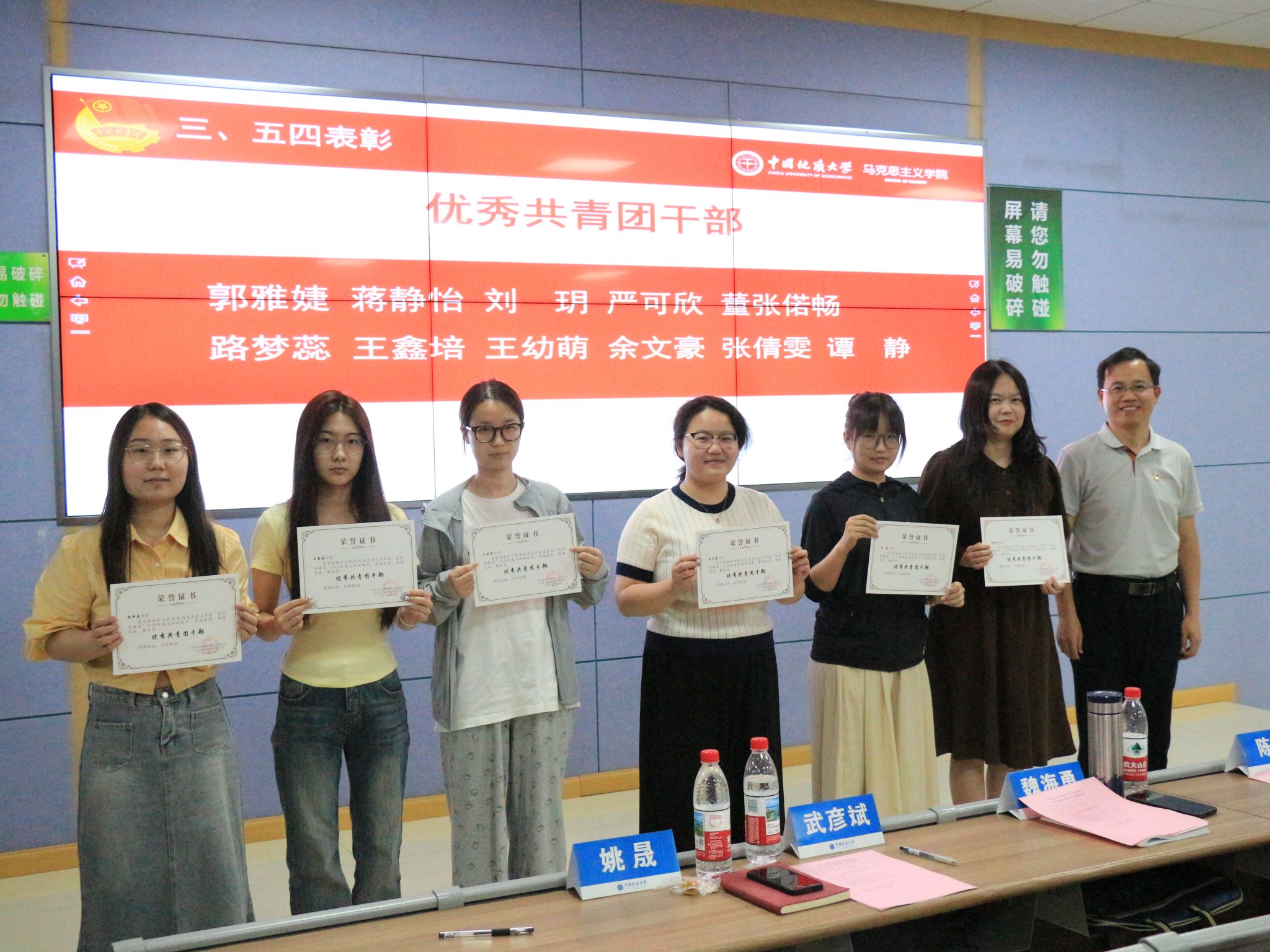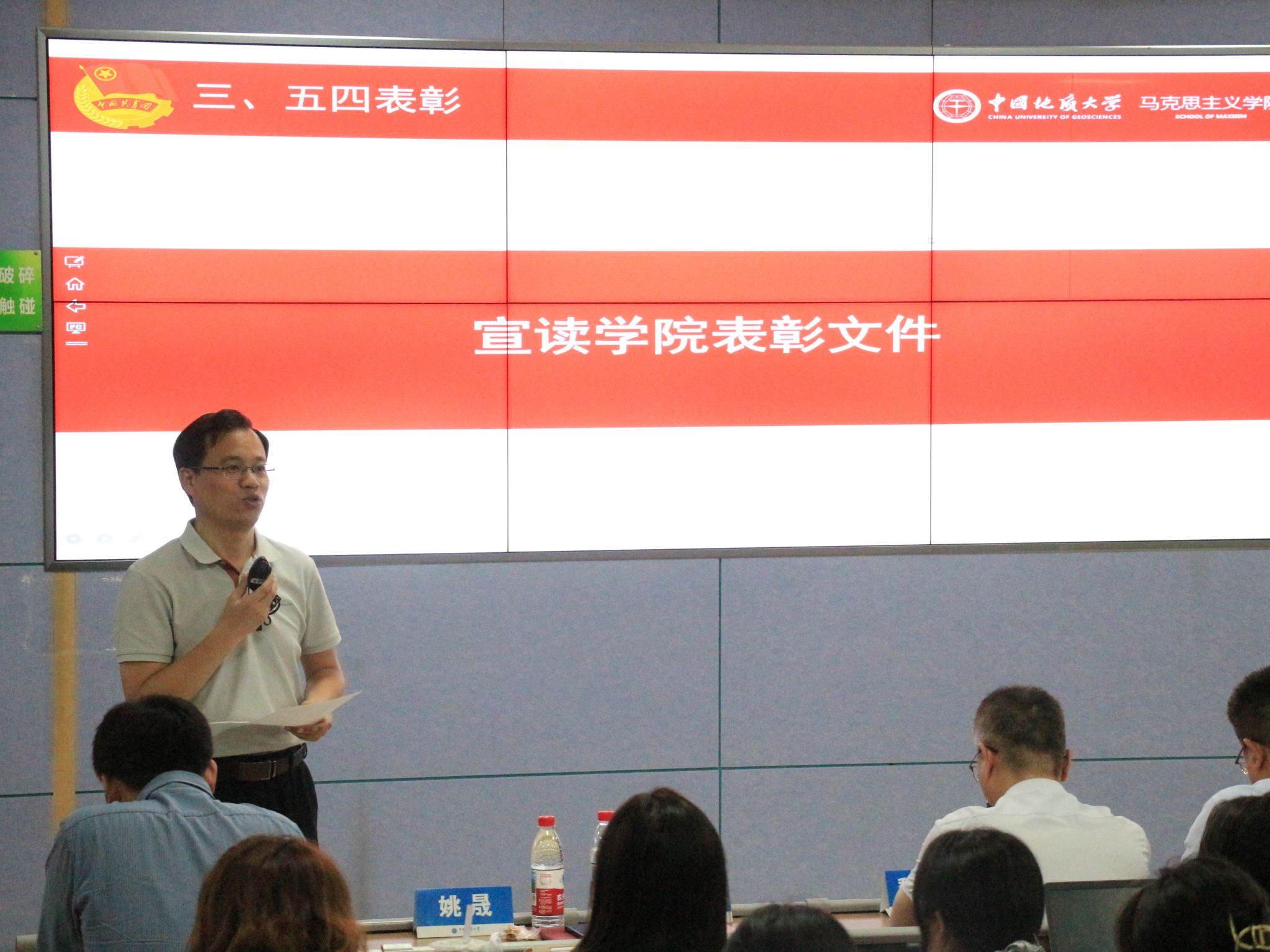 姚晟带领全体人员共唱团歌并通报学院团委工作。武彦斌宣读五四评优表彰文件。学院共表彰红旗团支部、学生标兵、优秀共青团员、优秀共青团干部、优秀志愿服务团队、优秀社团等30余个集体与个人。